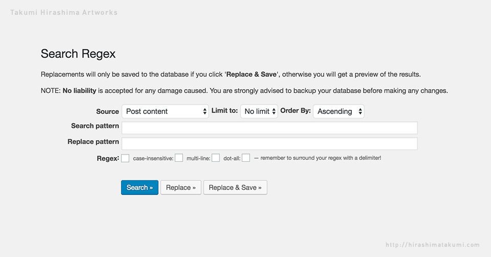 WordPress で投稿と固定ページの情報を、検索・置換することができるプラグイン Search Regex の使い方を紹介します。
